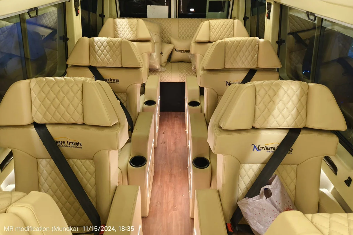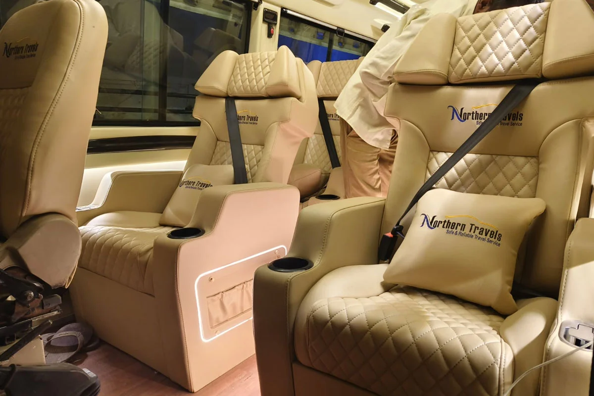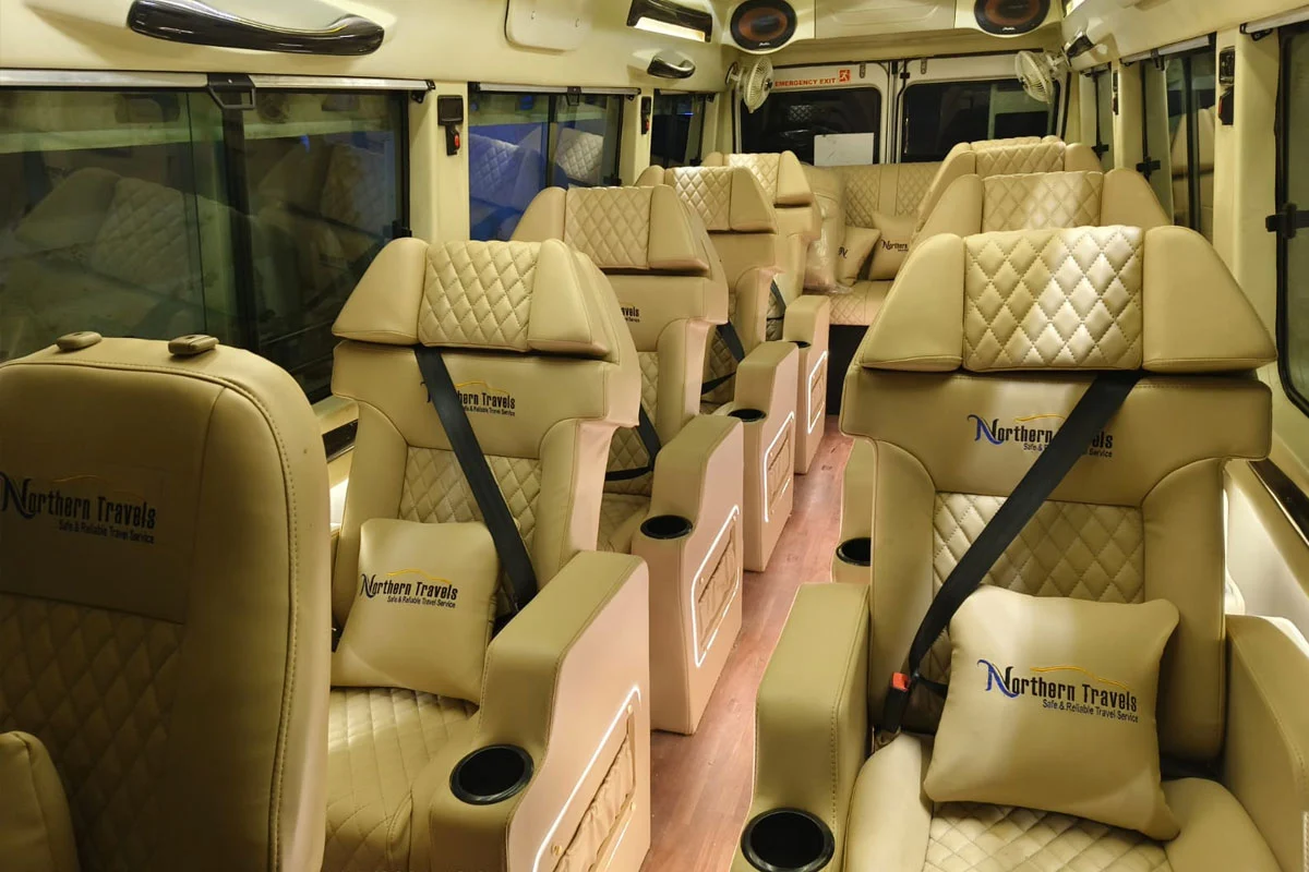 12 seater luxury Tempo Traveller is utilized in traveling by small families or business trip reason in which some organizations and individuals need to go for the excursion for some days. It is available for outstation tours to the north part of India as well as for local tours with Airport pick up and drop-offs. Travel Arrangements can be done very easily if you settle with the correct vehicle required while traveling. In the event that you want to go with your gathering of 12 individuals at that point to appreciate the moment altogether then a 12 seater tempo Traveller hire from Northern Travels is the solution. Our 12 seater tempo travellers are extensive, comfortable with a lot of extra space to move around, and furnished with cooling, similar to the 17 seater extravagance tempo travellers, which is awesome for a vast family. The vehicles have couches at the back which can be utilized to sleep.