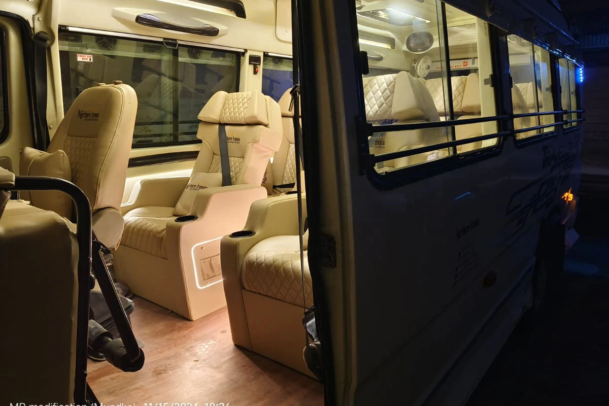 12 seater tempo travellers on rent are available at competitive prices. These tempo travellers are of good quality and accessible in both AC and non-AC variations and can be chosen according to the client's necessity. Commuters can be seated easily in the tempo traveller and from there on they can make the most of their trip. It has push-back seats with the facility of modifying according to your seating solace. An appropriate first aid kit is likewise accessible to the tempo traveller. Alongside that, for the passenger's entertainment, DVD and LCD are available for you to appreciate melodies and watch motion pictures.